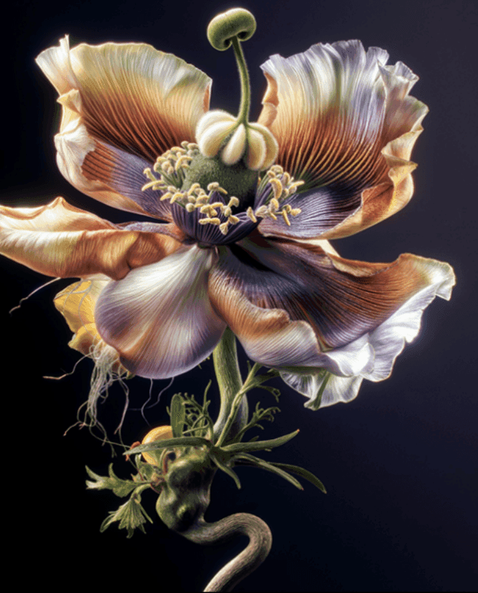 Hybrid Species is a fine art project that continues the exploration of digital florathrough speculative botanical art. It is part of an ongoing fine art seriesthat began in 2020 with Artificial Bloom, where 3D programs and naturalpatterns played a central role in the creative process. This artwork series isthe first to utilize AI in the creation process to push the boundaries ofdigital botanical artistry, featuring 80 intricately crafted floral designs. Drawing inspiration from a wide variety of real-world species, flowers, fruits,and other botanical elements are blended into hyperrealistic hybrids that feelboth familiar and otherworldly.