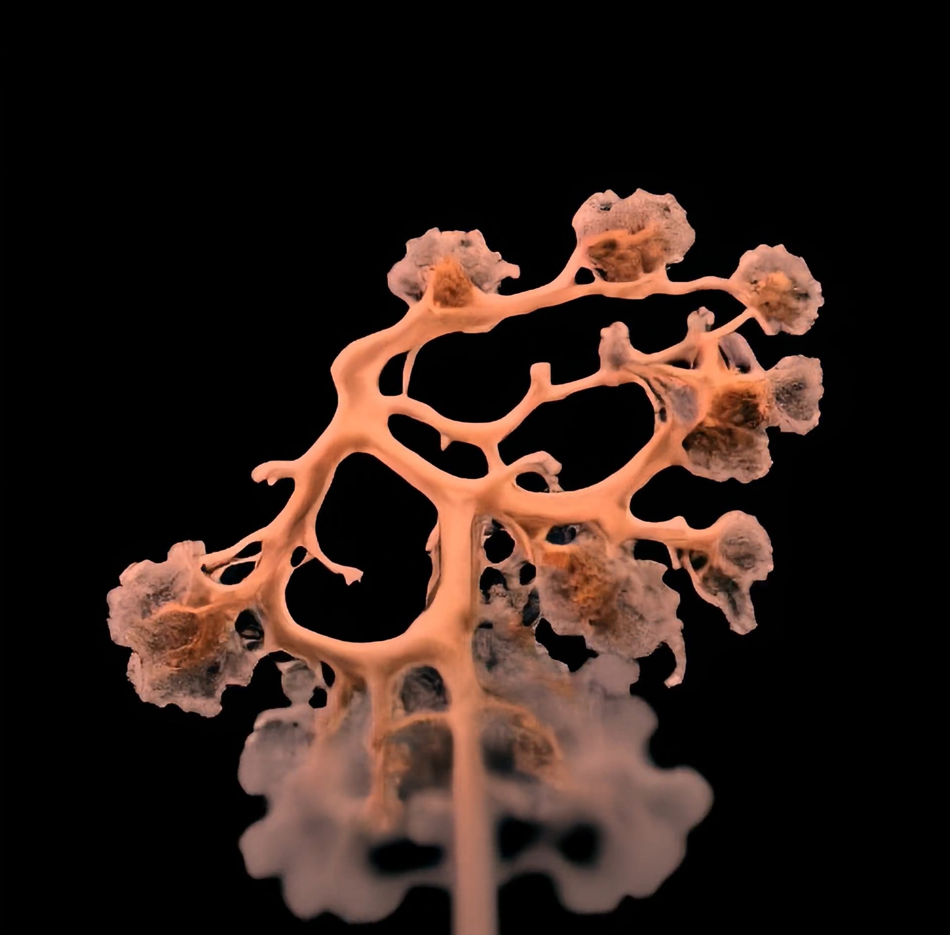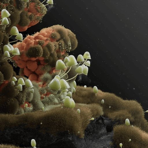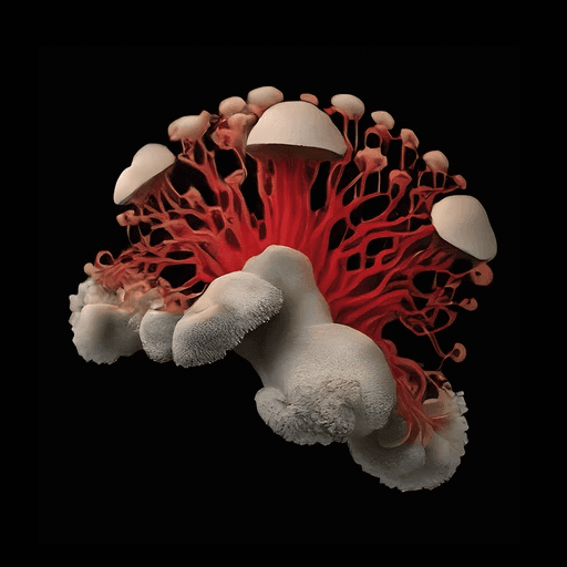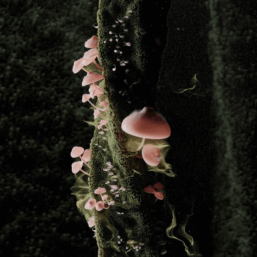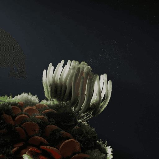 The Caelestis stemonitis, often mistaken for a mushroom, is actually a type of slime mold, distinct from true fungi. Found in the darkest corners of ancient forests, it emerges during late summer night under the light of a full moon. As it releases its spores in an enchanting motion, its delicate hair-like structures swing gently, dispersing them into the air, carried by unseen currents—a quiet, mesmerizing dance of nature’s resilience.