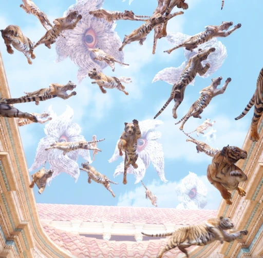 Flying tigers soar around a temple, their ethereal forms blending power and grace. The ancient structure stands as a sacred stage, where untamed strength meets timeless reverence.