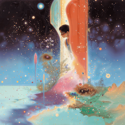A caged dream, restless and bound, weaves through towering illusions—flying giraffes that defy reason. Each flap of its wings carves a path through doubt, until the window—hope's glimmer—offers escape. The bird becomes a metaphor for the soul, breaking free from the surreal labyrinth of life's constraints into the vast sky of possibility.