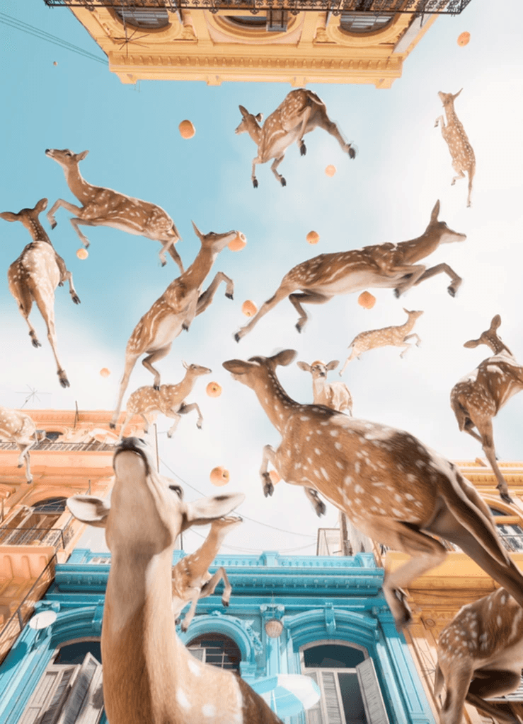 Floating Bambis soar through endless clouds, reaching for radiant apples that drift like dreams in the sky. Their journey speaks of resilience—never giving up, even when the goal feels distant. Each leap embodies faith, a quiet assurance that a higher power lights the way forward, turning obstacles into stepping stones.