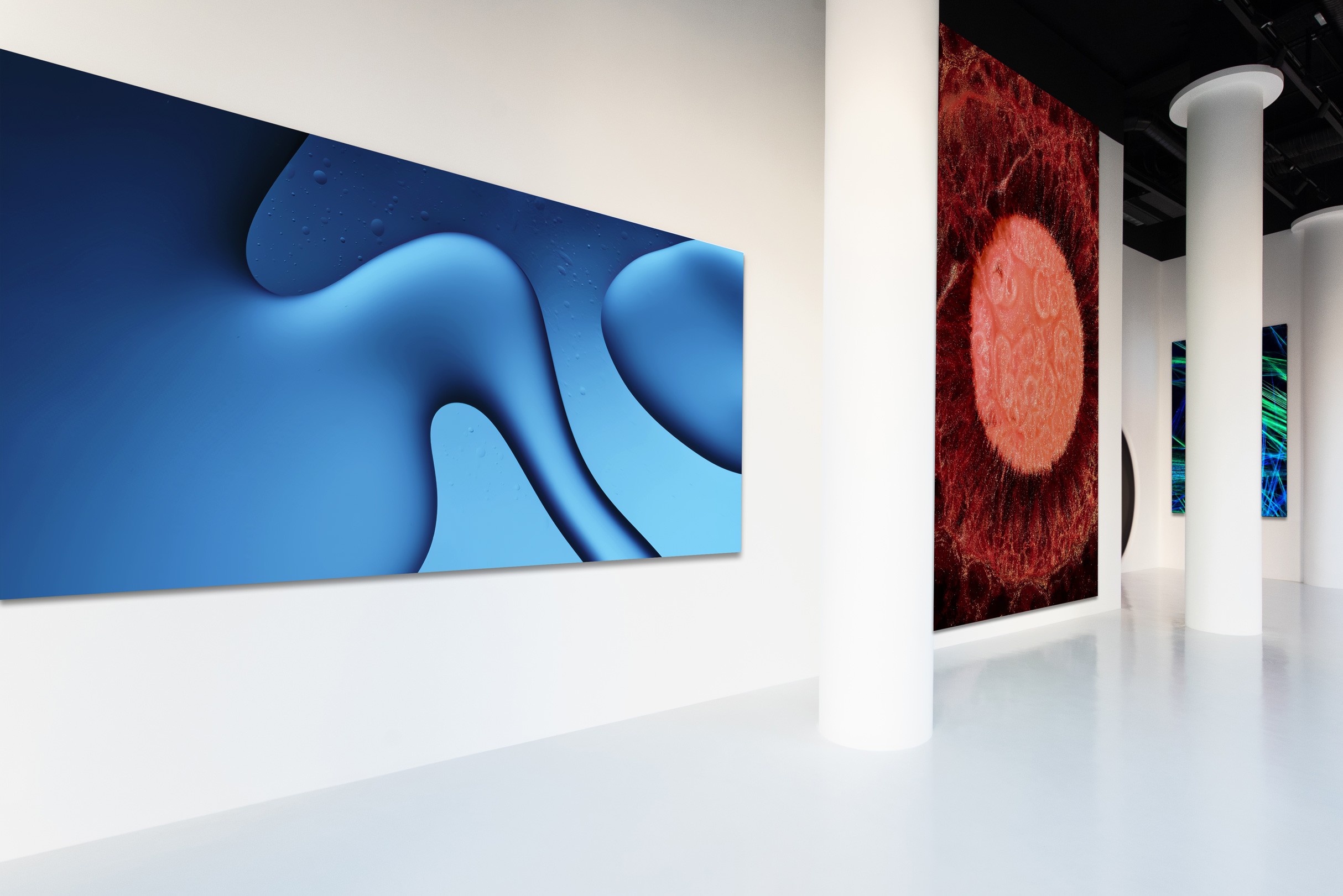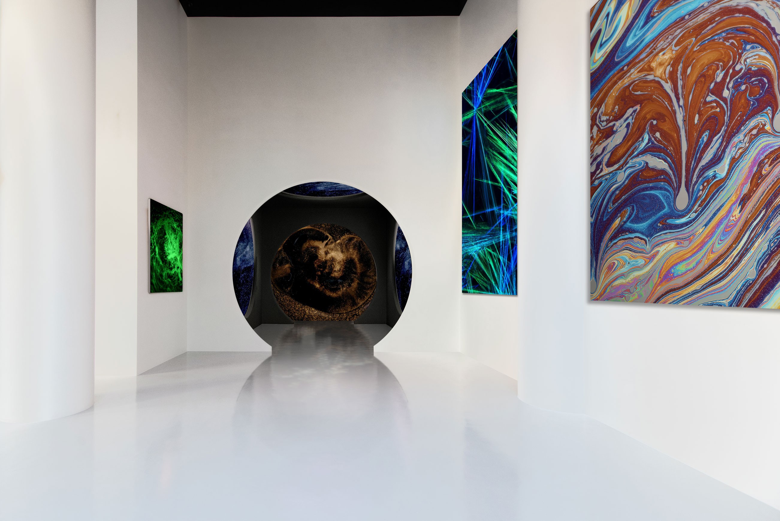 The videos – called Water, Fire, Refractions, Ice, Lava, Cosmos, Alchemy – represent materialities, blended together to explore macroscopic landscapes. They mirror geological conditions and evoke primordial energy in transformation: water ripples, lava, ice, light refractions, energy outbursts, and eruptions. Each landscape has been meticulously chosen; these pieces capture the dynamic forces of organic matter, transporting the audience to Hamill’s cosmogenesis and crafted materialities.