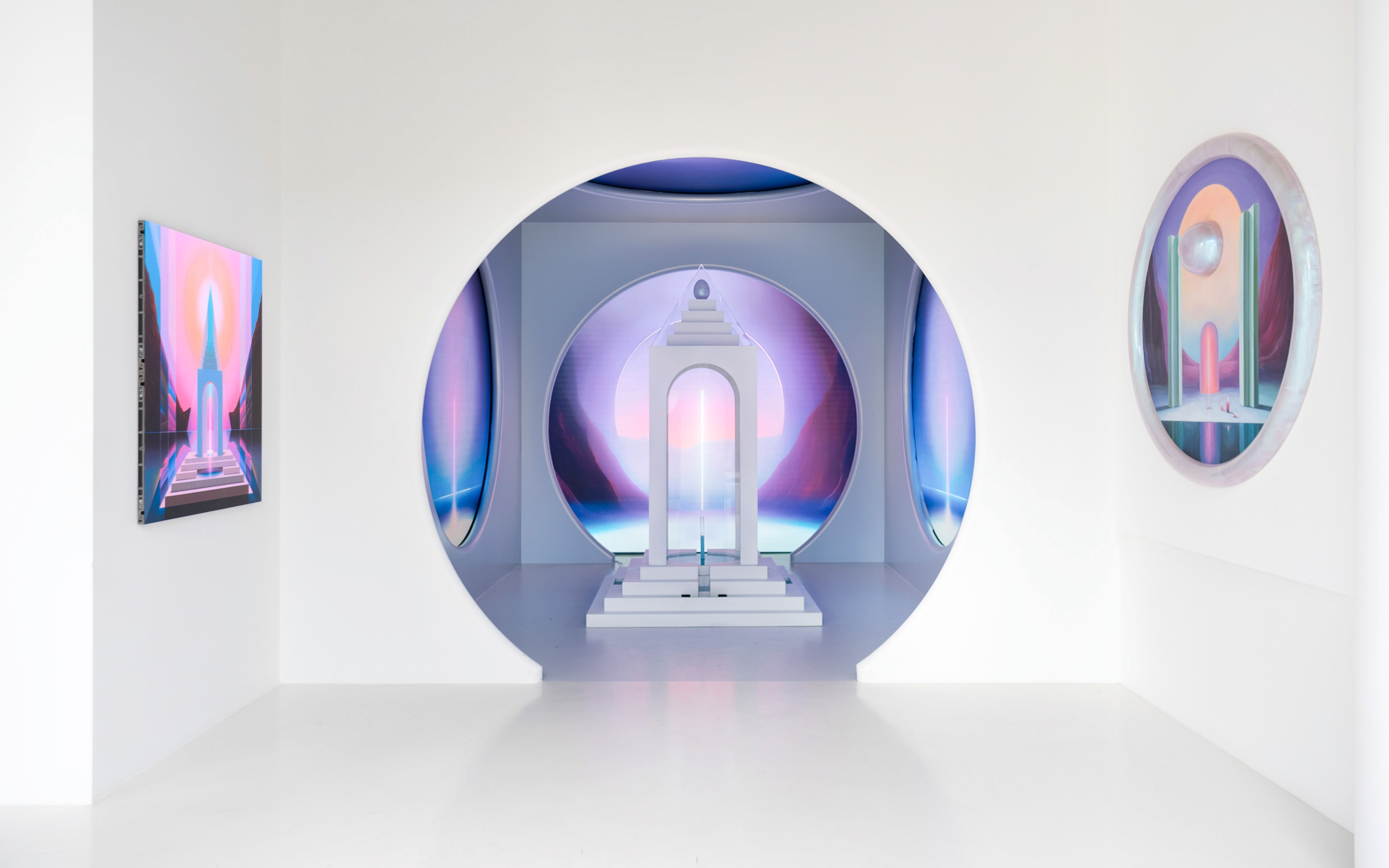 Unlike traditional surrealism, Zeta’s approach is not chaotic or spontaneous but controlled and structured. Her precise compositions rely on bold colour, reflective materials, and iridescent surfaces that distort and transform space, creating an unmistakable dreamlike quality. Her mysticism is neither purely ethereal nor abstract; instead, it is grounded in an intentional, almost ritualistic process, offering a pathway into a symbolic, futuristic world.