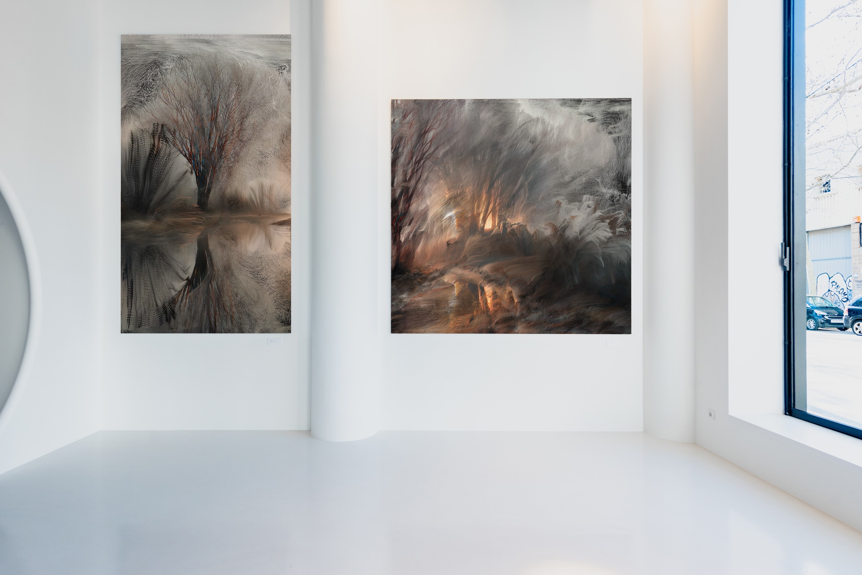 Visually, the works evoke alchemy: forms dissolve and recombine as if pigments were diffusing through water. A landscape with a solitary tree gradually mutates into an ambiguous organic form, then disperses into abstraction, only to reconstitute itself — a subtle game the subconscious plays with memory and form.