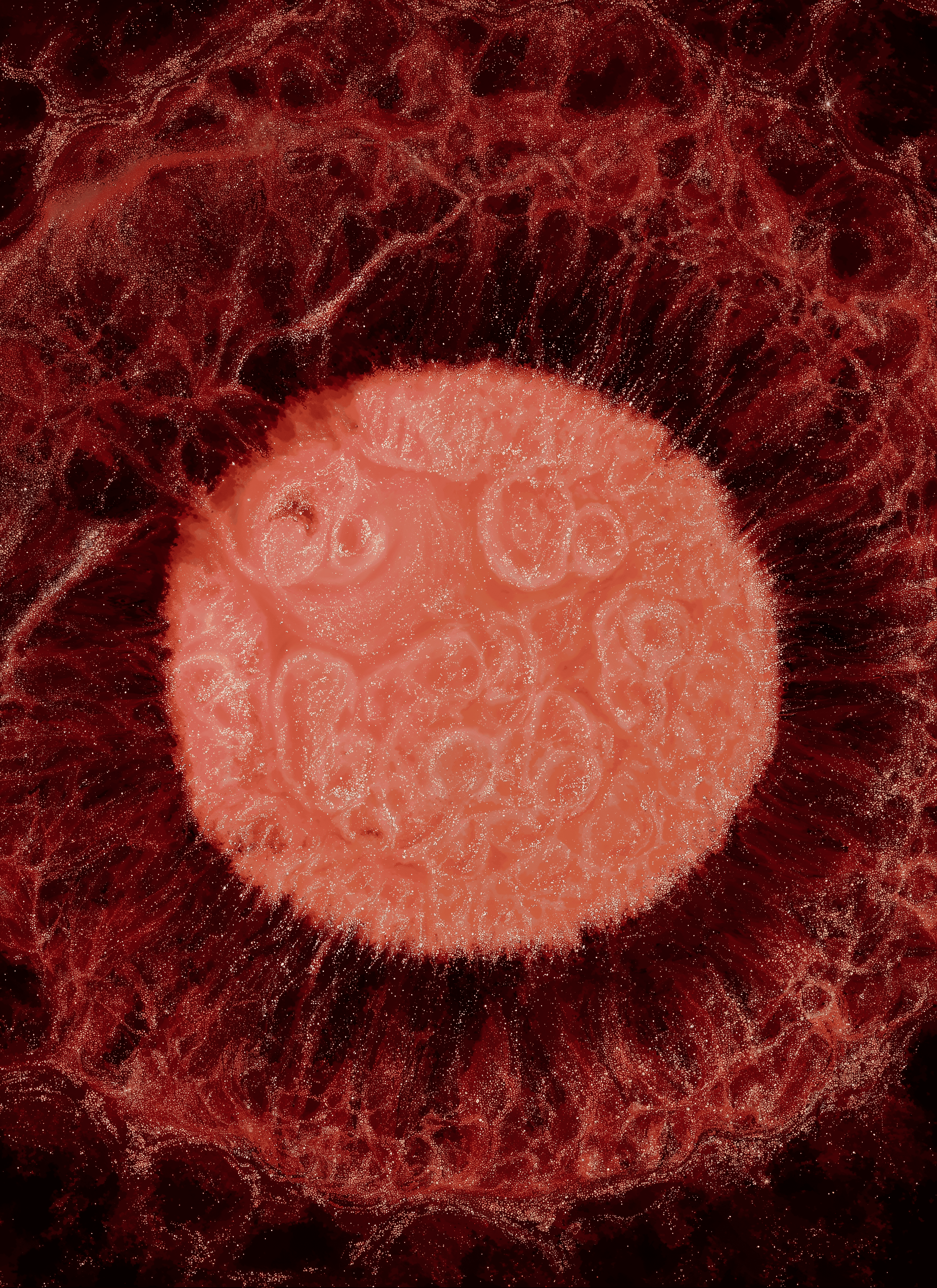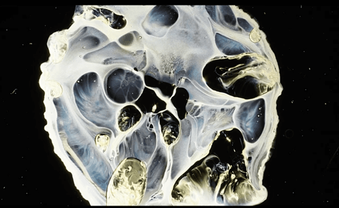 Filming of orchestrated chemical reactions using non-pigment based compounds. Using drops of these various products, I build layers of stable liquid and break them apart. Colors come from the reaction. Dimensions variable